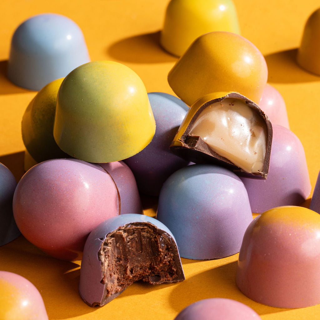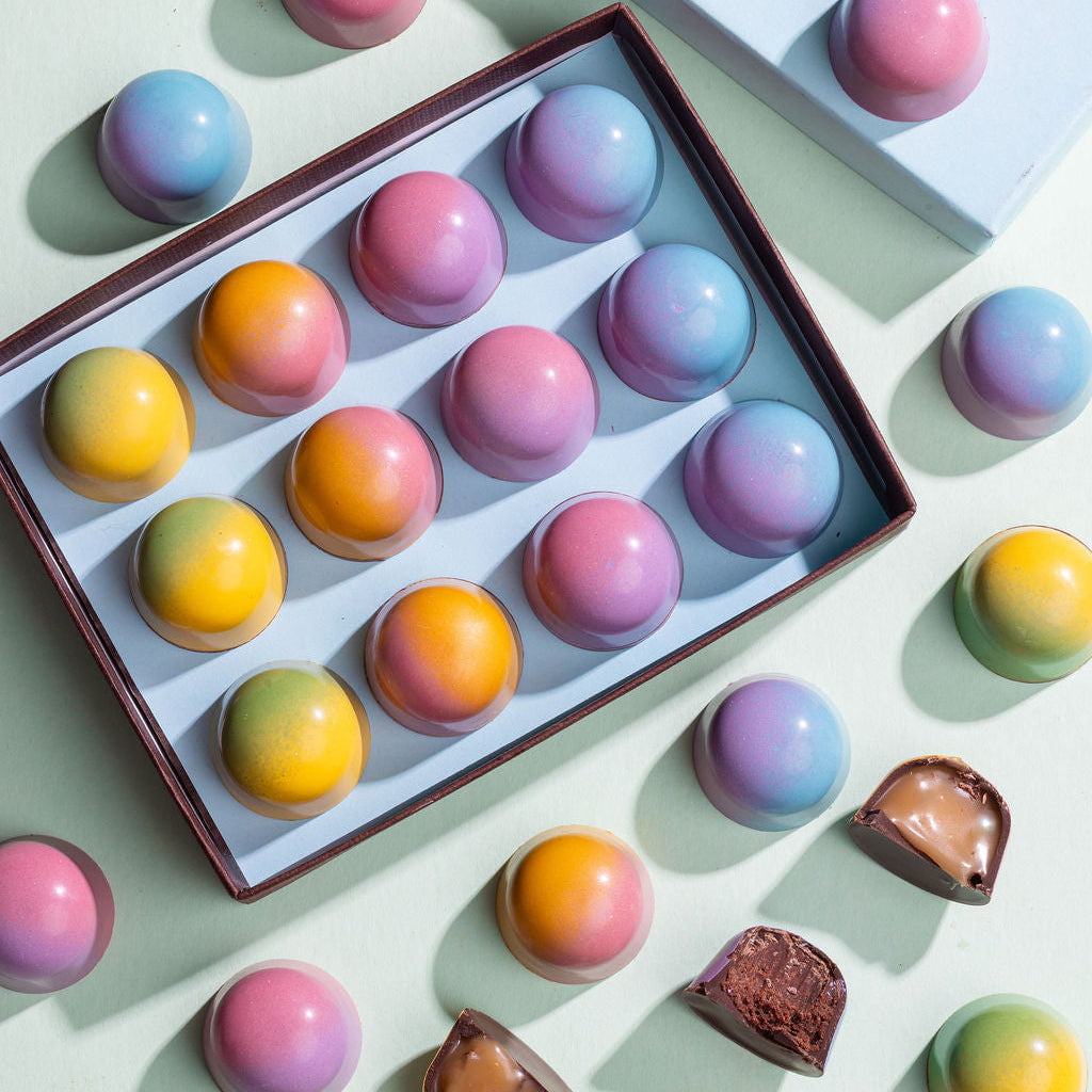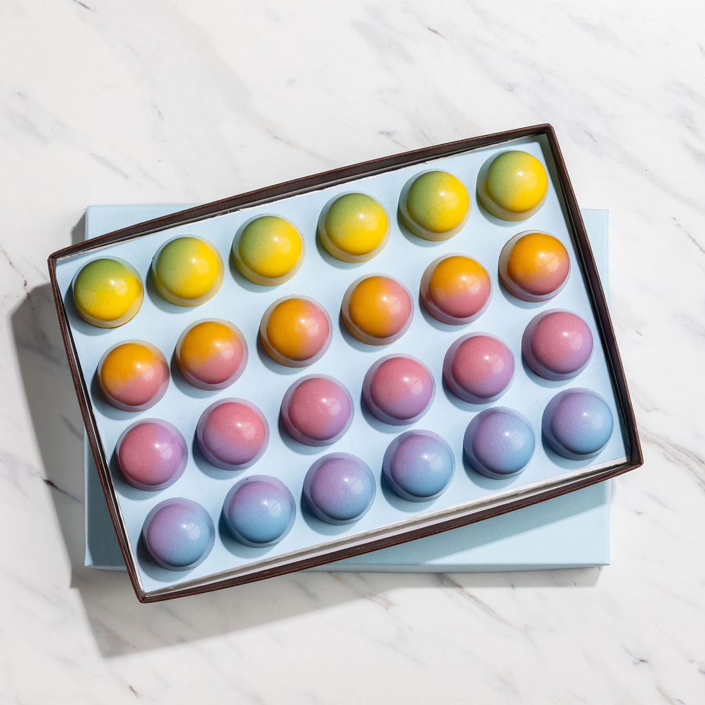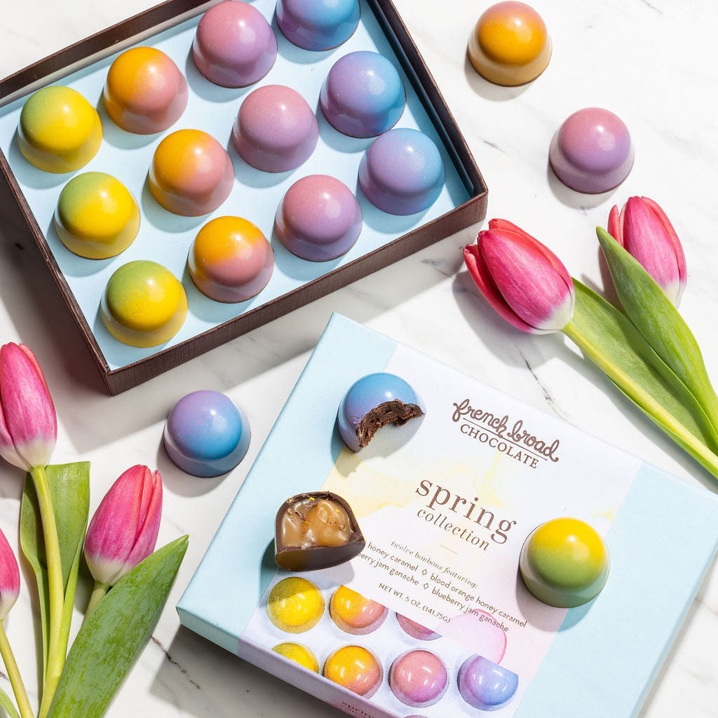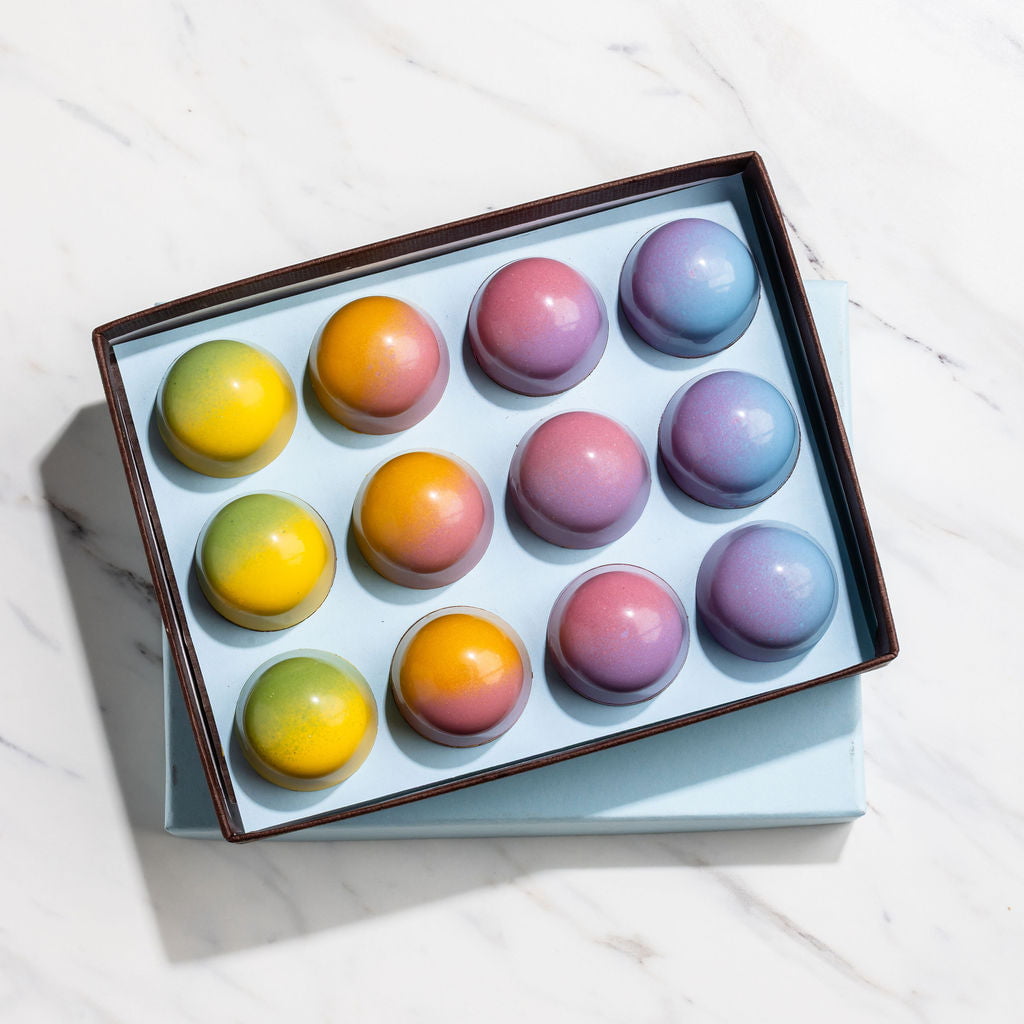 Inspired by flavors of the season, like bursting berries and freshly squeezed citrus, our Spring Collection was created as an homage to our favorite end-of-winter flavors. We’ve used naturally colored cocoa butter to decorate these beautiful confections by hand, too!